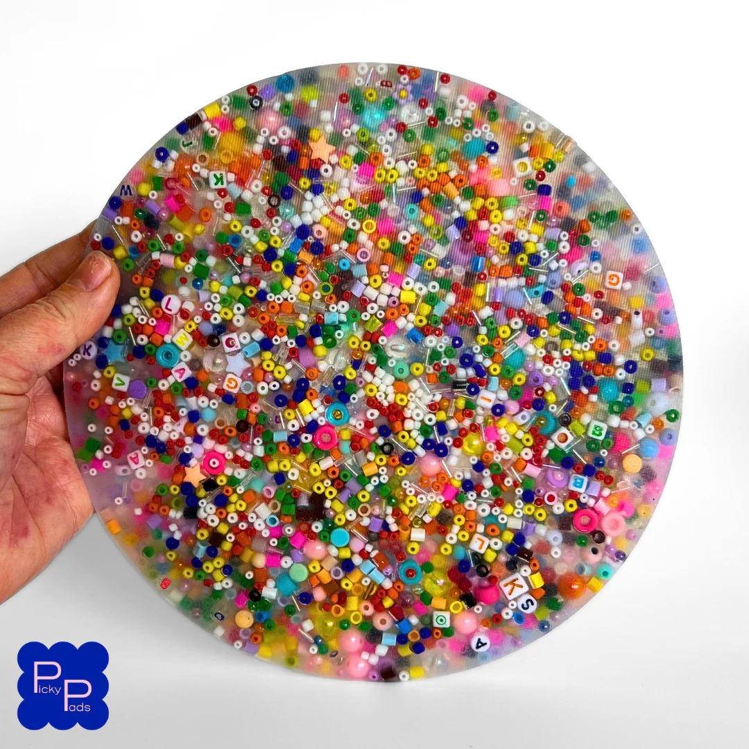 Exclusive to Picky Pads is an extra large Picky Pad measuring a whopping 21cm (8.2 Inches)! It comes filled with thousands of beads in varying sizes, shapes and textures so you get weeks of picking from one Picky Pad.